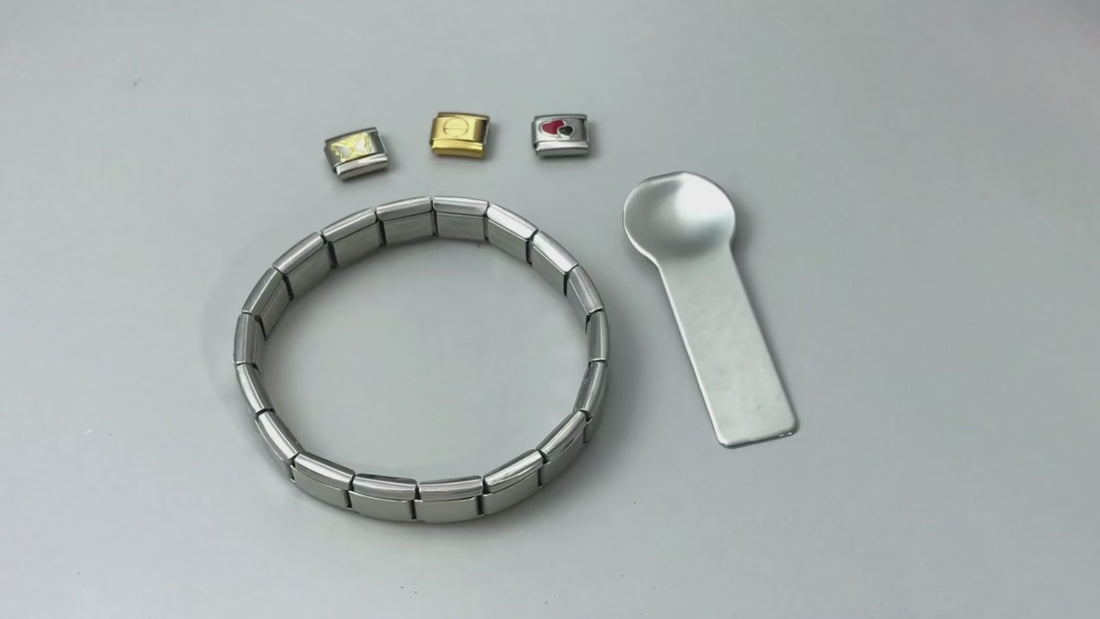 Assieme al bracciale viene fornito il comodo utensile per facilitare la rimozione e l'aggiunta di maglie e ciondoli.