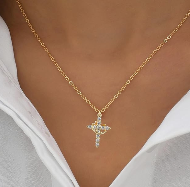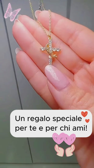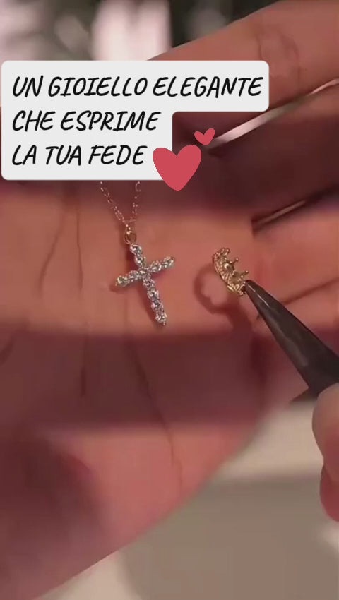 La corona puo' ruotare liberamente attorno alla croce senza il rischio di uscirne. La collana e' realizzata nelle varianti di colore oro e argento. I materiali impiegati sono pregiati e resistenti quali zirconia e acciaio inossidabile ✨